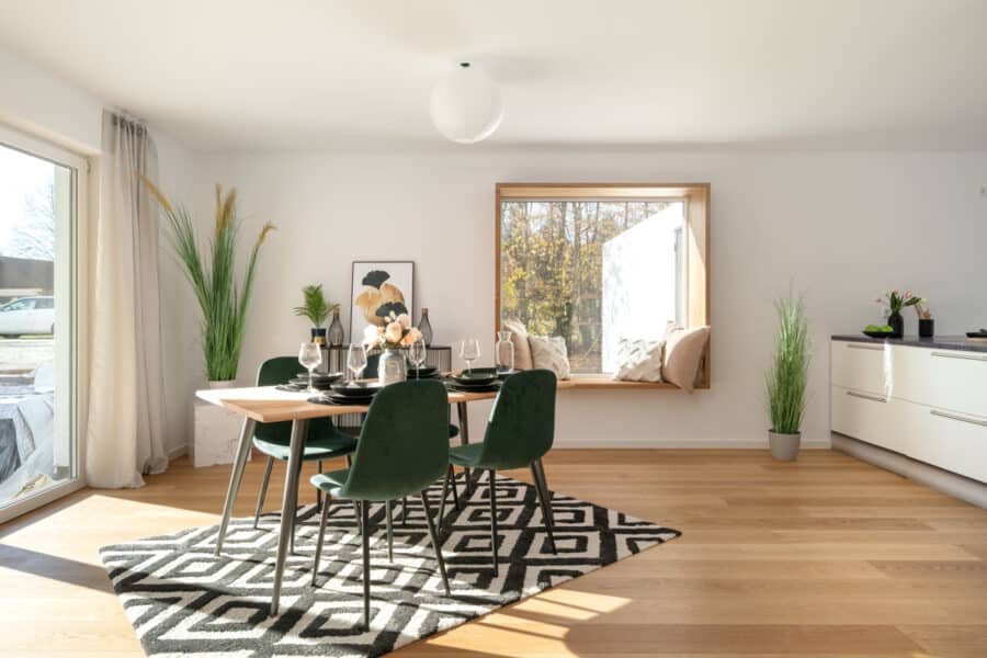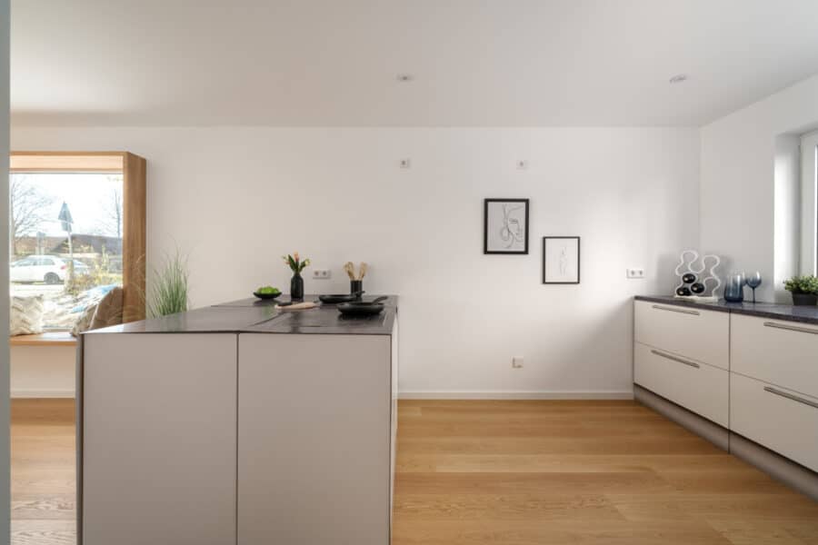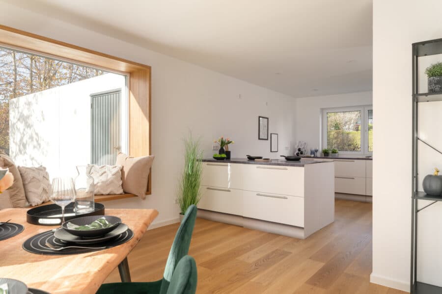 Unter Verwendung hochwertigster Materialien & Armaturen wurde dieses Haus zu einem regelrechten Schmuckstück mit modernster Technik ausgebaut. Bereits am Eingang wird man von viel Holz, in Form einer Echtholzeingangstür mit Glaselement sowie Naturholzparkett aus Eiche empfangen. Das komplette Haus sowie die Treppenhäuser wurden mit wunderschönem Echtholz ausgekleidet und wird durch Spots elegant beleuchtet. Die großzügige, zum Wohnzimmer hin offene Küche mit Option einer Kücheninsel macht das gemeinsame Kochen zu einem Vergnügen, und lässt das Wohnzimmer zu einem Ort der Begegnung werden. Im großzügigen Wohnzimmer befindet sich ein Highlight des Hauses, das von Holz umrandete Sitzfenster, welches zum Lesen und Entspannen einlädt und den ganzen Raum zusätzlich mit reichlich Tageslicht flutet.