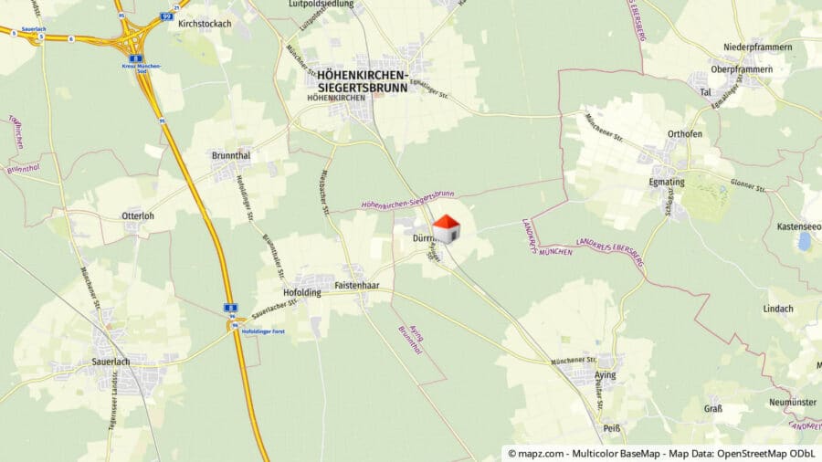 Dürrnhaar ist ein idyllischer Ortsteil der Gemeinde Aying im südlichen Münchner Landkreis. Das Dorf liegt drei Kilometer nördlich von Aying entfernt und hat ca. 700 Einwohner. Zentral im Ort gelegen befindet sich die S-Bahn-Station „Dürrnhaar“ in Richtung Münchner Innenstadt. Von Ihrem neuen Zuhause fußläufig in 2min erreichbar, besser geht es nicht. Auch die Nähe zur Autobahn A8 Richtung München und Salzburg ist für Pendler mit dem Auto sehr attraktiv. In Dürrnhaar befindet sich ein Kindergarten, Grund- und weiterführende Schulen gibt es in den angrenzenden Dörfern wie Höhenkirchen-Siegertsbrunn. Geschäfte und Läden für den alltäglichen Gebrauch finden Sie in Aying sowie in Höhnenkirchen Siegertsbrunn. Beide Ortschaften erreichen Sie mit dem Auto in ca. 5 Minuten. Besonders erwähnenswert ist der hohe Freizeitwert dieser Gegend. Zum einen durch die Nähe zu den bayrischen Alpen, zum anderen ist die Gemeinde Aying ein beliebtes Ausflugsziel für alle, welche bayrische Tradition, urige Biergärten und echte Bierbraukunst erleben wollen.
