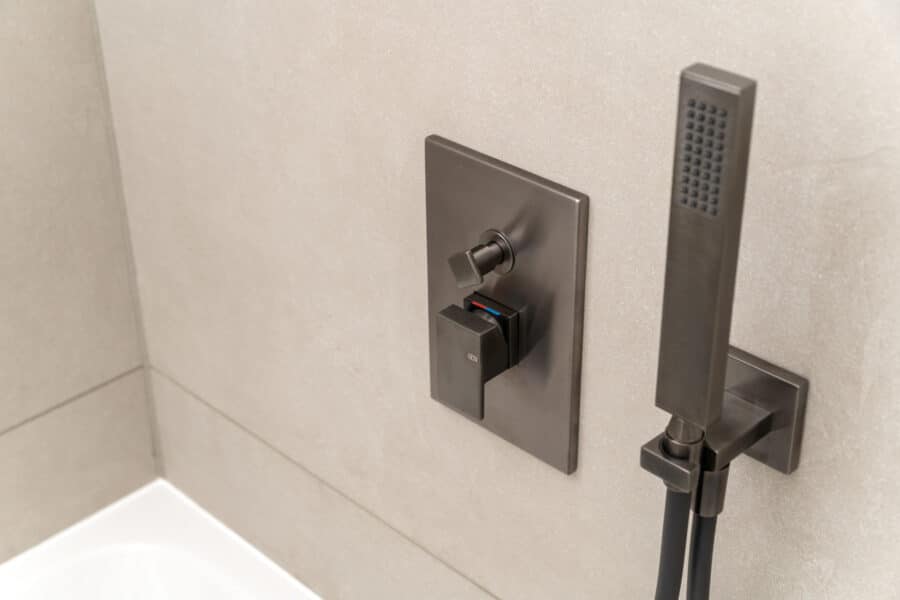 Neben dem Bett und in den Ecken sowie im angrenzenden Bad mit Badewanne und Regendusche wurden Bodenspots verbaut, die die Räume fantastisch in Szene setzen.