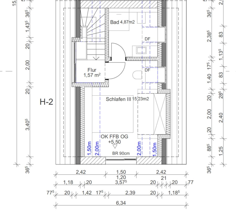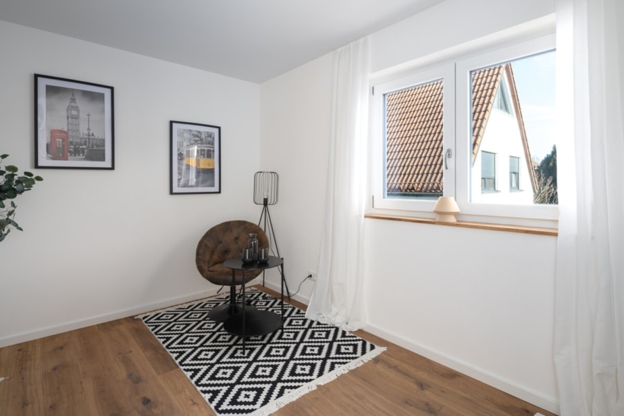 Das Obergeschoss gestaltet sich als komfortabler Rückzugsort für die Familie. Hier stehen zwei Schlafzimmer sowie ein Badezimmer mit Badewanne zur Verfügung. Vor dem -im Plan mit „Kind II“ bezeichneten- Raum erstreckt sich eine wunderbare Dachterrasse. Ein Traum für eines Ihrer größeren Kinder oder als Erweiterung Ihres Homeoffices. Das offene Treppenhaus sorgt dafür, dass auch diese Etage von Licht durchflutet wird.