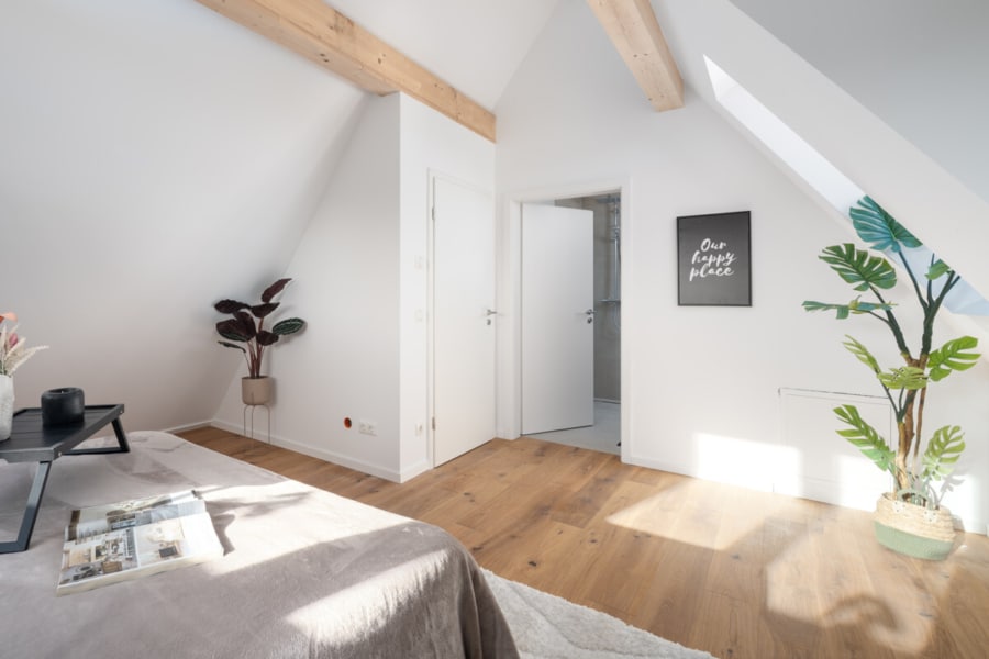 Im Dachgeschoss findet sich ein großzügiges weiteres Schlafzimmer sowie ein Masterbad mit Dusche wieder. Auch hier prägen Helligkeit und klare Linien das Ambiente.