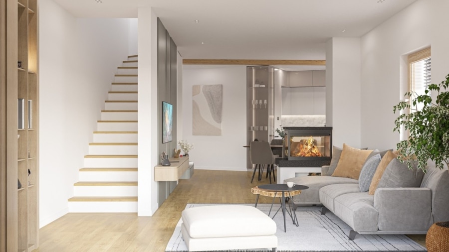 Im Inneren überzeugt das Haus mit einer klaren, offenen Architektur und großzügigem Raumgefühl. Raumhöhen von etwa 2,50 m – auch im wohnraumgeeigneten Untergeschoss – sorgen für eine helle und luftige Atmosphäre. Eine Fußbodenheizung in allen Etagen gewährleistet gleichmäßige Wärme und hohen Wohnkomfort. Große Holz-Alu-Fenster mit elektrisch steuerbaren Lamellen lassen viel Tageslicht in die Räume und verbinden moderne Technik mit natürlicher Wohnästhetik.