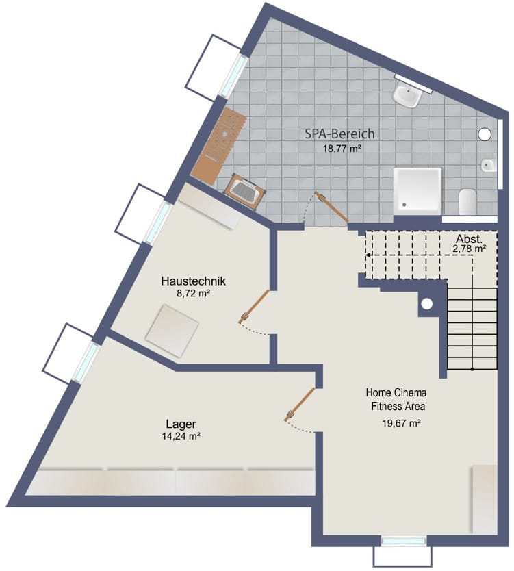 Die Bäder sind hochwertig vorbereitet und lassen Raum für individuelle Akzente. Ob Armaturen, Sanitärobjekte oder Materialien – hier kann der neue Eigentümer seinen persönlichen Stil verwirklichen. Rainshower-Duschen, Badewanne, Bidet sowie ein vorbereiteter SPA-Bereich bilden die Basis für ein privates Wellnessambiente auf hohem Niveau.