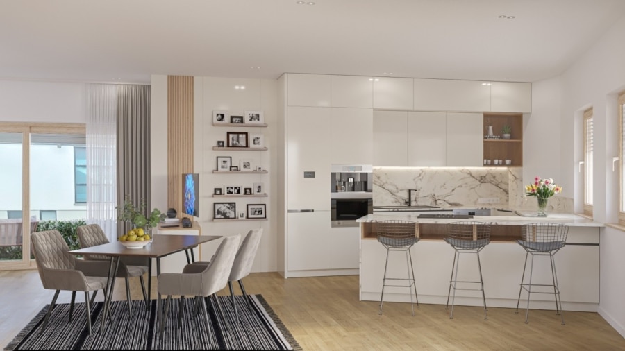 In allen Etagen ist eine einzeln regulierbare Fußbodenheizung verlegt, die in Kombination mit den vom Käufer wählbaren Echtholzböden ein behagliches und zugleich exklusives Wohngefühl schafft. Großformatige Holz-Alu-Fenster mit elektrischen Lamellen verbinden Design, Funktionalität und Wohnkomfort auf elegante Weise.