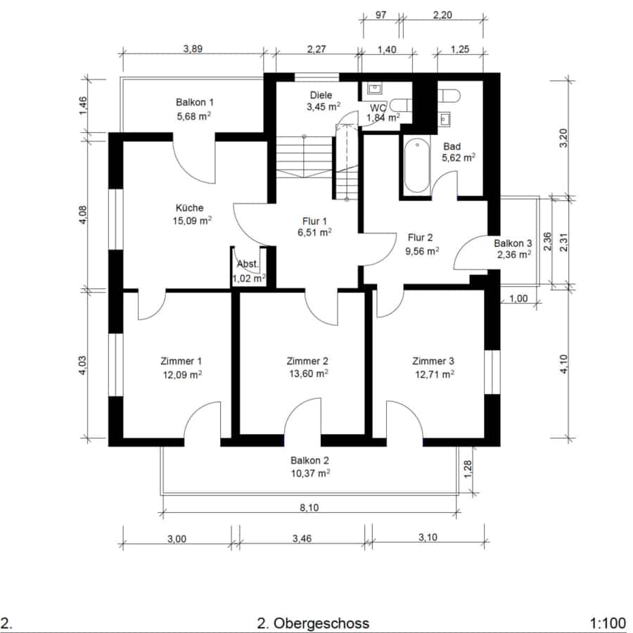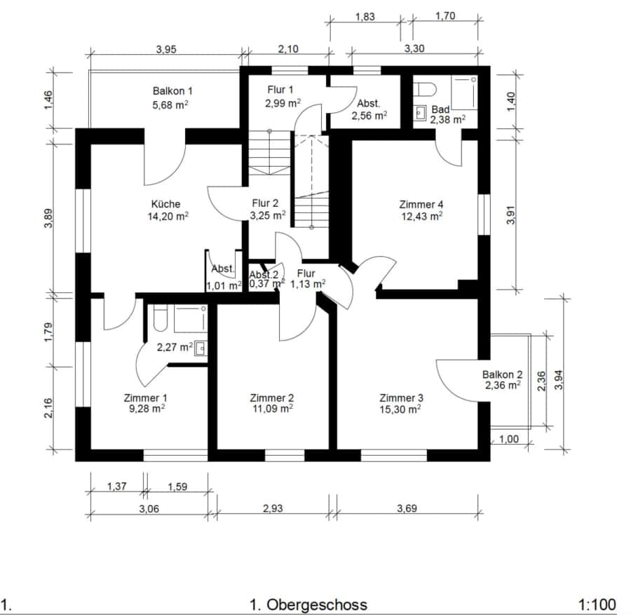 1. Obergeschoss: Platz für ein bis zwei Wohnungen, jeweils mit Balkon (insgesamt zwei Balkone)