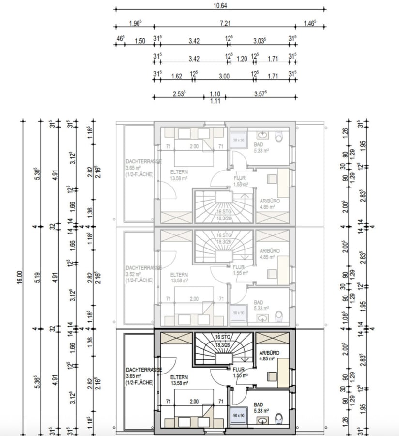 - Außenbereich: Große Terrasse im EG (ca. 8,46 m² angerechnet) und Dachterrasse im DG (ca. 3,61 m² angerechnet)