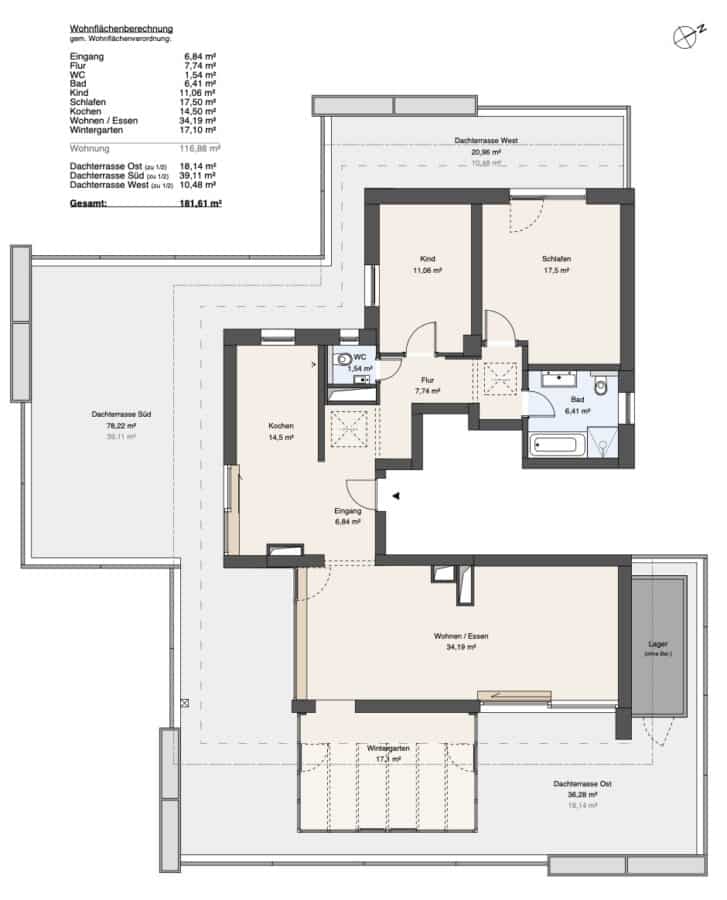 Vom repräsentativen Eingangsbereich gelangen Sie über den Flur in jedes Zimmer. Tagsüber ist der Flur über zwei Lichtkuppeln mit natürlichem Tageslicht versorgt. Die Größe der Zimmer ermöglicht komfortable Bewegungsflächen und ausreichend Platz für Möbel. In dem modern gefliesten Bad gibt es eine Badewanne und eine Regendusche sowie sämtliche Annehmlichkeiten wie Handtuchheizkörper, elektrische Fußbodenheizung und energiesparende LED-Spiegelbeleuchtung. Die großzügige und durchgehende Dachterrasse mit ihren ca. 135 qm Fläche ist nach Süden, Westen und Osten ausgerichtet und bietet viel Platz für sommerliche Tage. Im vollverglasten, beheizten und direkt an den Wohnbereich angeschlossenen Wintergarten können Sie auch kältere Tage genießen. Für optimale Aufbewahrung sorgt der eigene Abstell- und Lagerraum auf der Nordseite der Terrasse.