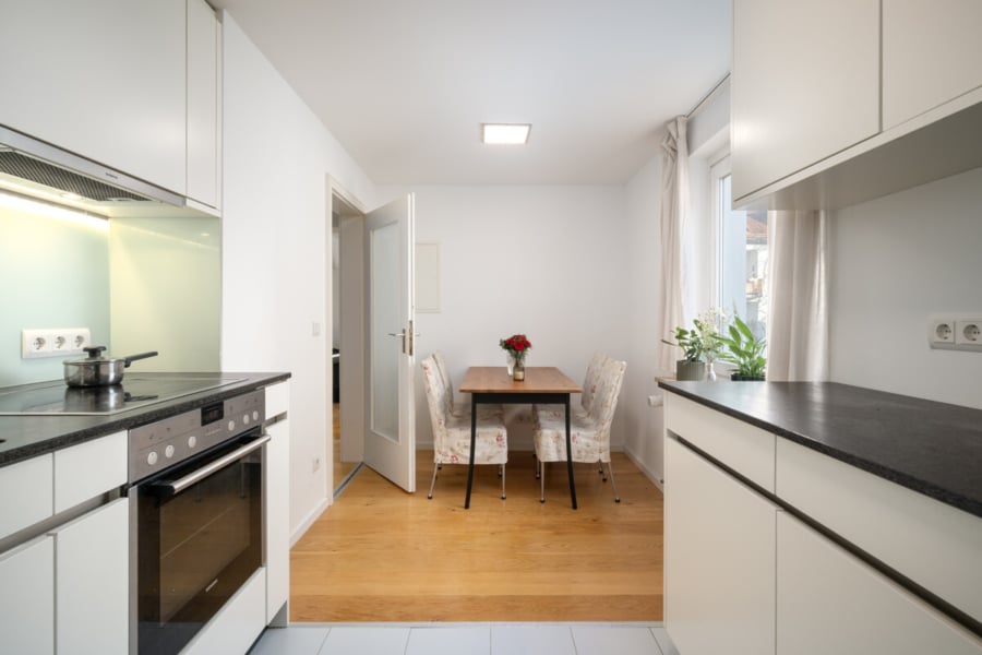 Die Ausstattung ist hochwertig, funktional und auf langfristige Vermietbarkeit ausgelegt. In den Wohnräumen ist Parkett verlegt, das professionell aufbereitet wurde, während Küche und Bad mit pflegeleichten Fliesen ausgestattet sind. Die rund zehn Jahre alte, maßgefertigte Schreinerküche überzeugt durch ihre hochwertige Ausführung mit Stein-Arbeitsplatte, Glasrückwand und integrierter Beleuchtung und befindet sich in einem sehr gepflegten Zustand. Die Raumaufteilung ist durchdacht und effizient, mit klar getrennten Bereichen für Wohnen, Schlafen, Kochen mit Essbereich und Bad, wodurch eine breite Zielgruppe angesprochen wird. Ausreichend Platz für Essbereich und Wohnmöblierung erhöht die Wohnqualität und unterstützt eine nachhaltige Vermietung.