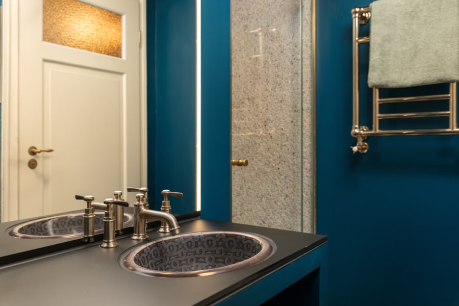 Das zweite Badezimmer ist im maurischen Stil gehalten und beeindruckt mit handgefertigten portugiesischen Zementfliesen von Mosaic del Sur, die farblich akzentuierte Muster setzen. Eine großzügige Walk-in-Dusche mit Glasabtrennung und einem Flusskiesel-Beton-Wandfinish sorgt für einen dezent natürlichen Akzent. Hochwertige Messingarmaturen ergänzen die kunstvoll geformte Kohler-Waschschale, deren elegante Linienführung und seidige Keramikoberfläche einen stilistischen Mittelpunkt bildet. Eine elektrisch geregelte Fußbodenheizung rundet den Komfort ab.