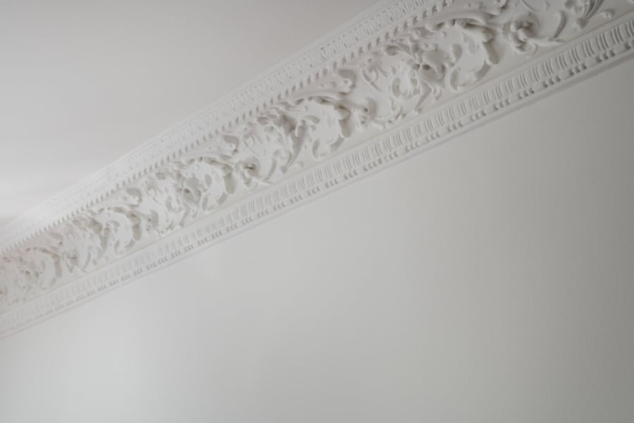 - Prachtvoller Deckenstuck mit breiten umlaufenden Friesen und zentralen Rosetten in Wohn- und Schlafzimmern