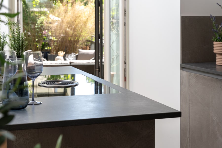 - Küche Dross & Schaffer: Freistehender Kochblock mit grifflosen Fronten (Tip-on), Pandomo-Oberflächen, Induktionskochfeld mit Bora-Muldenabzug, Backofen, Dampfgarer, Wärmeschublade, Kühl-Gefrier-Kombination von Miele, Gaggenau-Geschirrspüler, Avintage-Weinklimaschrank, Apothekerschrank, Edelstahlspüle, Arbeitsflächenbeleuchtung, ledergepolsterte Sitzbank, beleuchtete Wandnische mit Glasboden, wandbündiges Gläserregal mit Glastüren