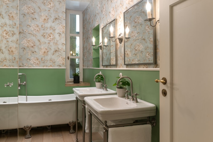 Das Hauptbadezimmer inszeniert romantischen Vintage-Charme mit zeitloser Eleganz: Auf warmem Eichen-Dielenparkett steht eine freistehende Wanne als souveräner Mittelpunkt. Zwei Waschtische mit feinen Keramikbecken werden von historisierenden Armaturen von Devon & Devon in poliertem Chrom akzentuiert; Wandleuchten rahmen die Doppelspiegel und setzen ein weiches, schmeichelndes Licht. Ein raumhoher Spiegelschrank bietet stilvollen Stauraum, während der Handtuchheizkörper ebenfalls von Devon & Devon wohltuende Wärme spendet. Die Wände sind mit einer fein gemusterten, eleganten Tapete aus England versehen, deren sanfte Farbnuancen perfekt mit den warmen Holztönen und dem Chromglanz harmonieren. Das Zusammenspiel dieser Elemente schafft eine weiche, einladende Atmosphäre, die Behaglichkeit und luxuriöse Raffinesse in vollkommener Balance vereint.