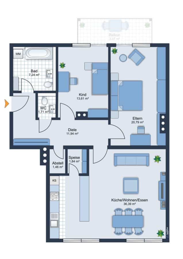 - Direkter Zugang von Schlafzimmer und Kinder-/Arbeitszimmer auf den Balkon (in Planung)