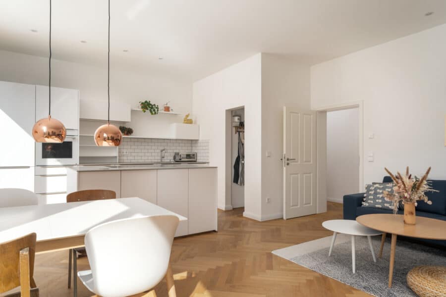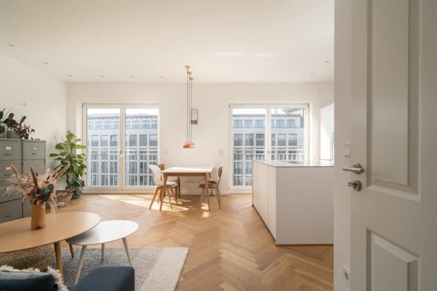 Absolutes Highlight der Wohnung ist das großzügige Wohnzimmer. Neben dem gemütlichen Couchbereich ist hier viel Platz für mehrere Personen am Esstisch. Die energiesparende LED-Beleuchtung an der Decke ermöglicht ein gute Ausleuchtung des Raumes. Nach Süden ausgerichtet bezieht es durch seine bodentiefen Fenster besonders viel Tageslicht.