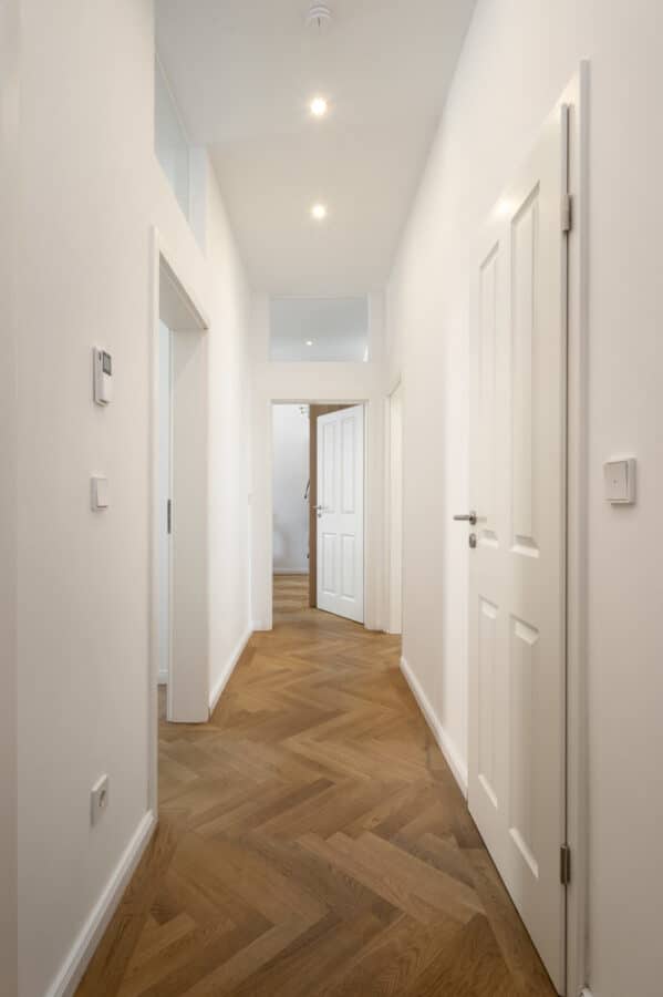 Vom repräsentativen Eingang gelangt man über den flächensparenden Flur und Dielenbereich in alle Zimmer und Räume. Das modernisierte Bad verfügt über eine Toilette, einen zweiseitigen, energiesparenden LED-beleuchteten Wandspiel und eine komfortable, bodengleiche Regendusche. Das sehr geschmackvolle Design und die Auswahl der Materialien und Oberflächen lassen das Bad mehr als Wellnessoase erscheinen. Für die Ausstattung wurden designorientierte Armaturen namhafter Hersteller verbaut. Das separate Gäste-WC ist im gleichen Stil renoviert worden und hebt das ansprechende Gesamtkonzept besonders deutlich hervor.