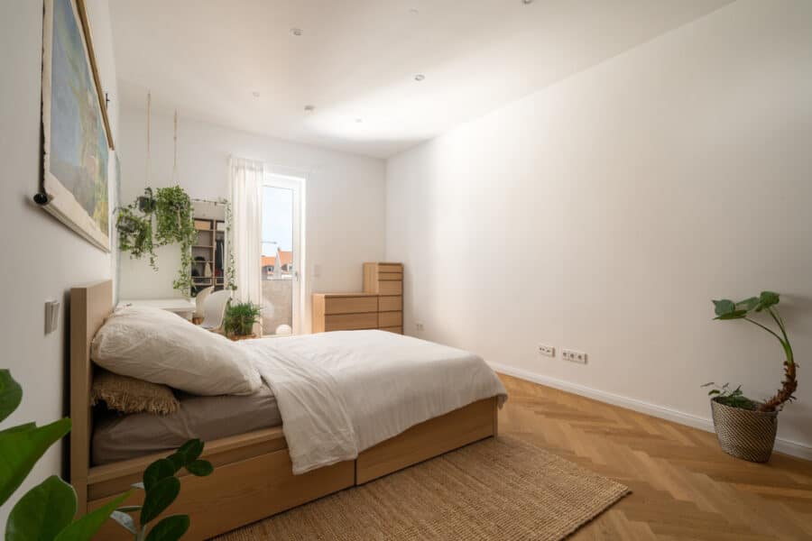 Das Schlafzimmer sowie das Kinder- oder Arbeitszimmer bieten viel Platz für Schränke und garantieren durch ihre Nord-Ostausrichtung zum Innenhof eine ganzjährig konstante Zimmertemperatur und ruhige Nächte. Beide Zimmer verfügen über einen TV- und LAN-Anschluss, so dass auch das Homeoffice in dieser Wohnung nicht zu kurz kommt.