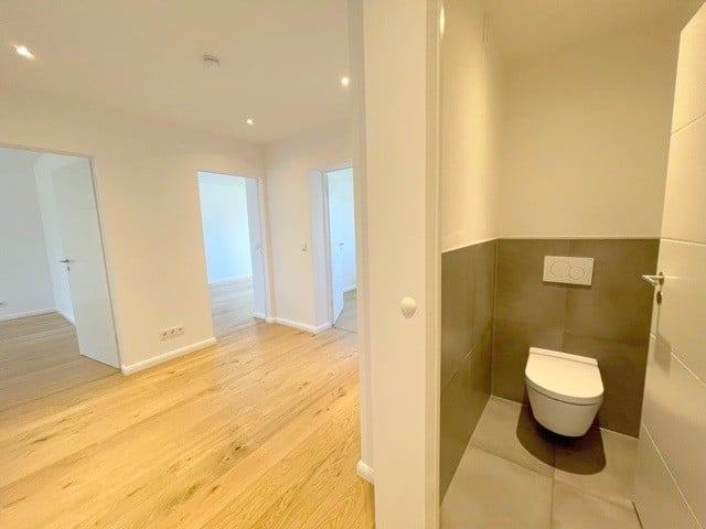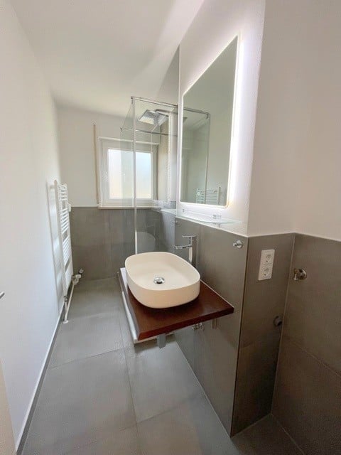 Gestaltung als Kinderzimmer, Gästezimmer oder für das Arbeiten im Home-Office zu. Das Badezimmer mit Fenster ist mit modernen grauen Wand- und Bodenfliesen, einer begehbaren Dusche mit Regendusche und einem Waschbecken mit Waschtisch ausgestattet. Zusätzlich zum Badezimmer finden Sie in der Wohnung ein separates WC.