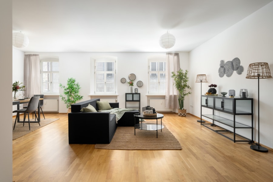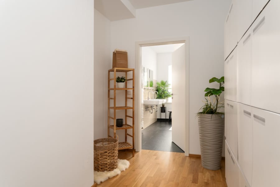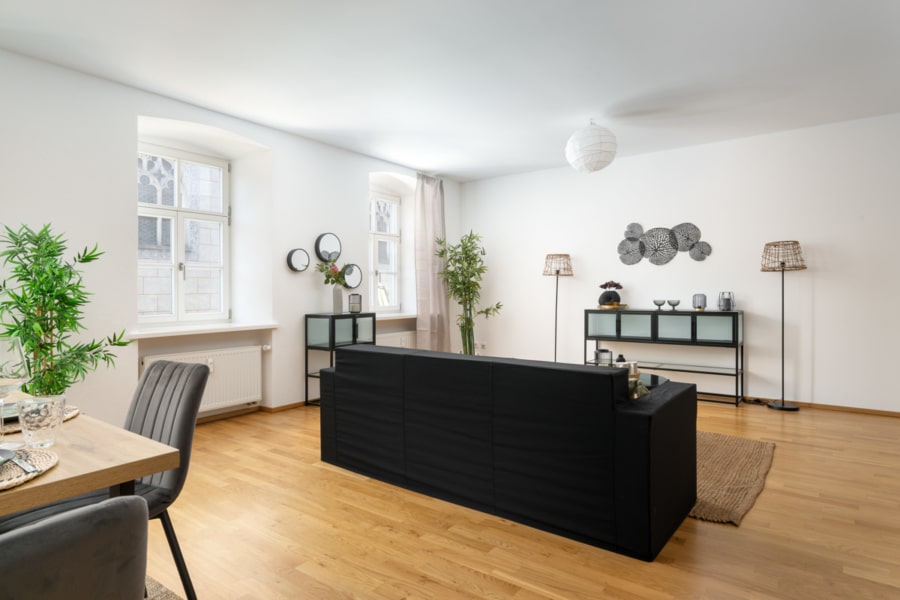 Von Ihrem Wohnzimmer können Sie durch drei große, von außen kaum einsehbare Fensterfronten auf das historische Rathaus und den Marienplatz blicken. Am separaten Gäste-WC vorbei haben Sie auch im Verbindungsgang zum Schlafzimmer und dem Badezimmer ausreichend Platz, um auch hier für Stauraum zu sorgen. Das großzügige und hochwertig eingerichtete Badezimmer mit zwei Waschbecken ist ein weiteres Highlight.