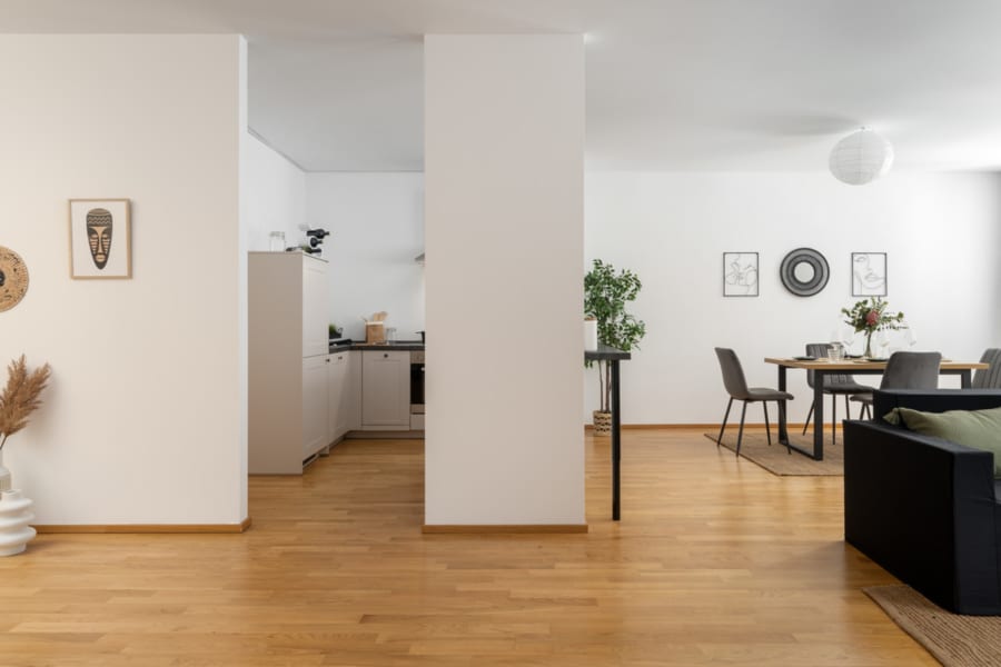 Die 107m² große, clever geschnittene Wohnung, verfügt über eine offene und voll ausgestattete Einbauküche. An der Küchentheke oder auch Barbereich können Ihre Gäste ihnen beim Kochen Gesellschaft leisten und ist oft das Zentrum von schönen Abenden. In einem separaten, über die Küche zugänglichen ca. 5m² großen Hauswirtschaftsraum haben die Waschmaschine und auch ein Wäschetrockner platz. Durch die Raumhöhe von über 2,60m können Sie hier auch mit Regalen den Raum voll ausnutzen, um Lebensmittel, oder auch sonstige zu verstauende Gegenstände, unterbringen.