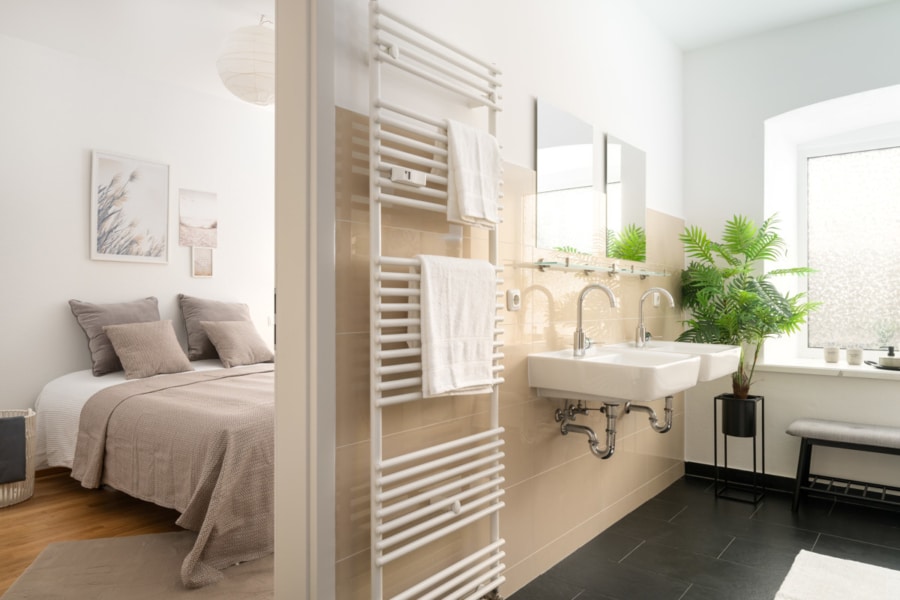 - Großes Bad mit zwei Waschbecken, Duschwanne & WC